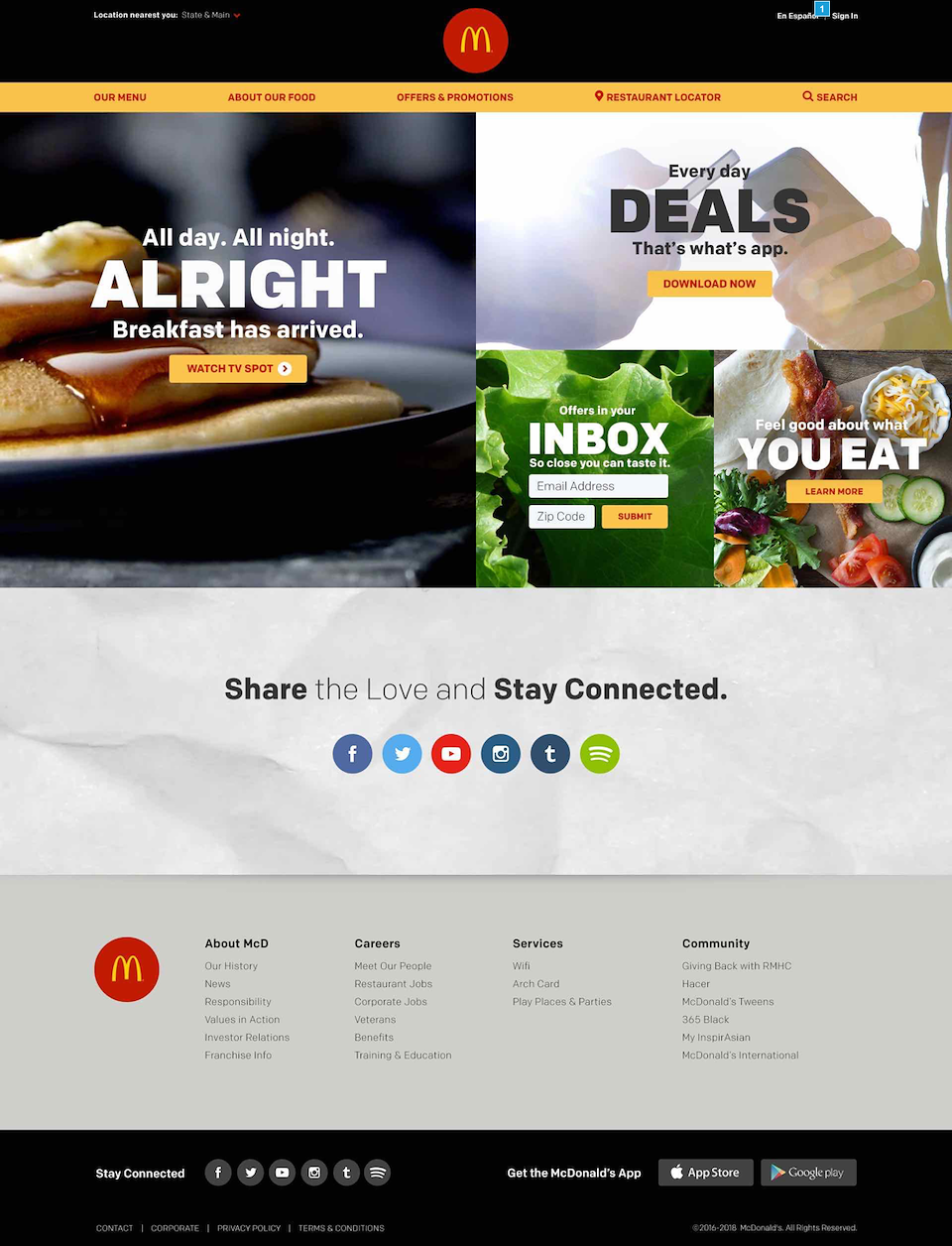 With the competitive market of “fast food” moving in the direction of healthy choices, McDonalds realized it needed to redesign its digital image. Pushing an easier to use interface, coupled with striking images, and capping it off with a strong push into the hispanic market, DDB, Alma, and McDonalds teamed up to offer a more engaging and healthier experience for its customers.
