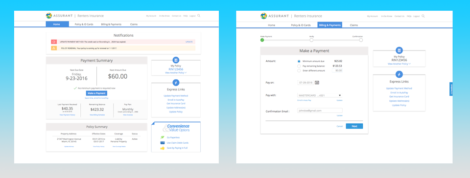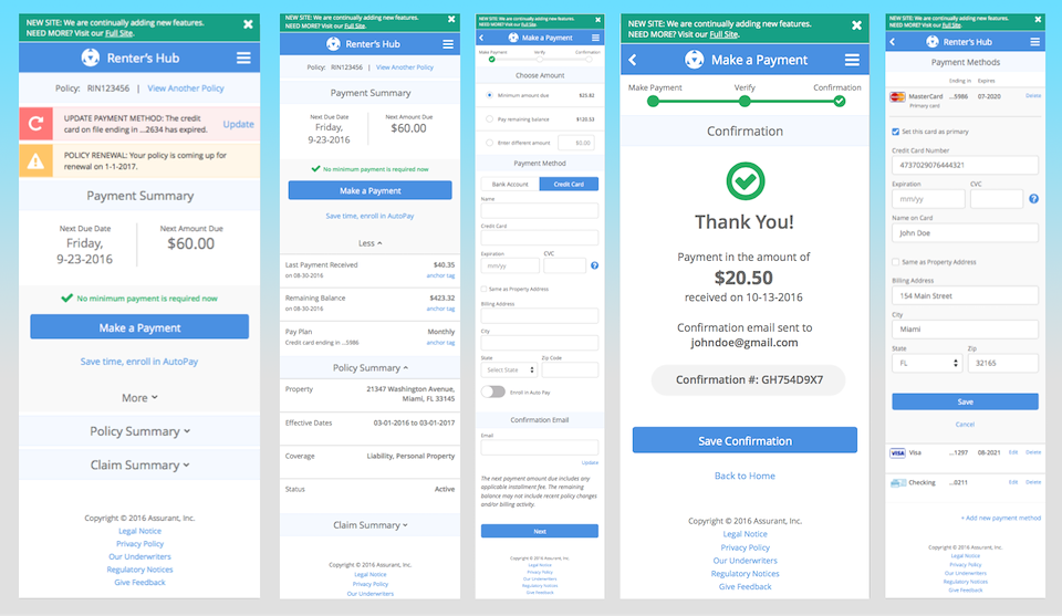 Renter's Insurance needed a makeover, especially their payment processing screens. Here is a sample of some of the desktop and mobile comps.