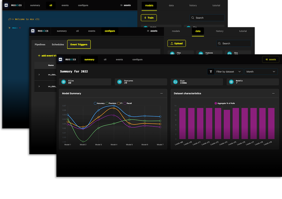 A React frontend, custom built, powerful, and sexy. Full CLI in browser, connects to backend allowing uploading of data, training of models, monitoring data, concept, and prediction drift, and exploration of model metrics.